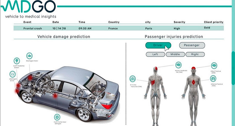 Технологія оцінки ступеня тяжкості травм від ізраїльського стартапу MDGo базується на складному алгоритмі, який в режимі реального часу оцінює стан здоров'я водія і пасажирів. Після ДТП система оповіщає медичні установи про травми, які були отримані.